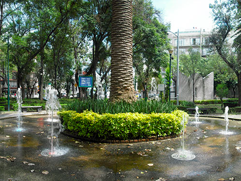 También en esta vista se llega apreciar la esquina de Félix Cuevas y Gabriel Mancera, El monumento a Manuel Gómez Morín y la fuente central del parque.