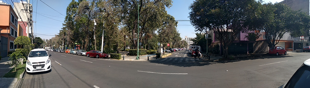 En esta vista 360 de la esquina de la calle Amores y calle Jardín Pascual Ortiz Rubio, calle que abarca sólo la cuadra del parque empezando desde esta esquina y acabando en Gabriel Mancera