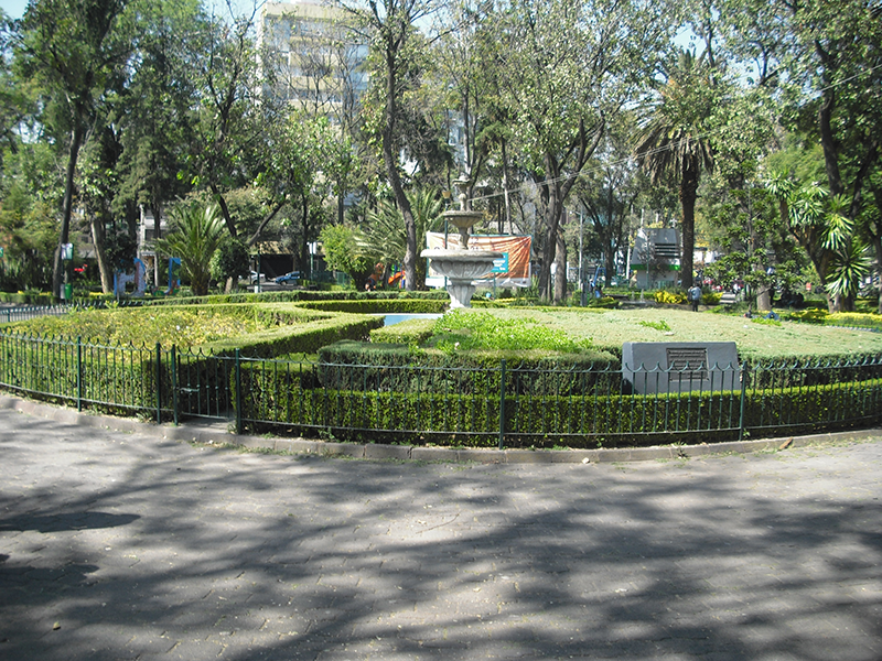 Caminando alrededor de la fuente al norte llegarás a la avenida Félix Cuevas, al sur la calle Jardín Pascual Ortiz Rubio, al este avenida Gabriel Mancera y al oeste la calle de Amores.