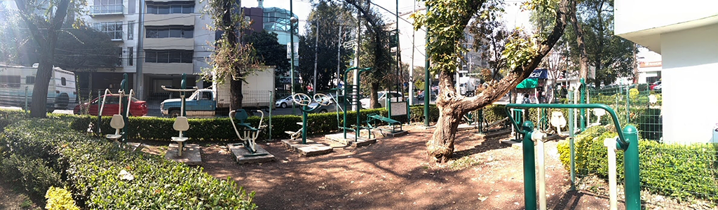 En esta vista 360 en el acceso a la izquierda encontrarás los juegos infantiles y a la derecha el Gimnasio a al aire libre, justo atrás de la caseta de policía